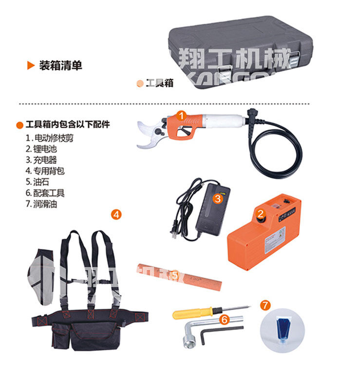 本產(chǎn)品為電池驅(qū)動電動修枝剪,由固定刀片、移動刀片、鋰電池、充電器、連接線、工作包、工具箱等部分組成,充電電壓為AC 110V~240V,主要應用于30mm以下果枝嫁接的剪切和修剪及大批果園修剪、收摘等。使用時簡捷方便,是傳統(tǒng)手工剪枝效率的8-10倍,修枝質(zhì)量明顯高于傳統(tǒng)手工剪刀。