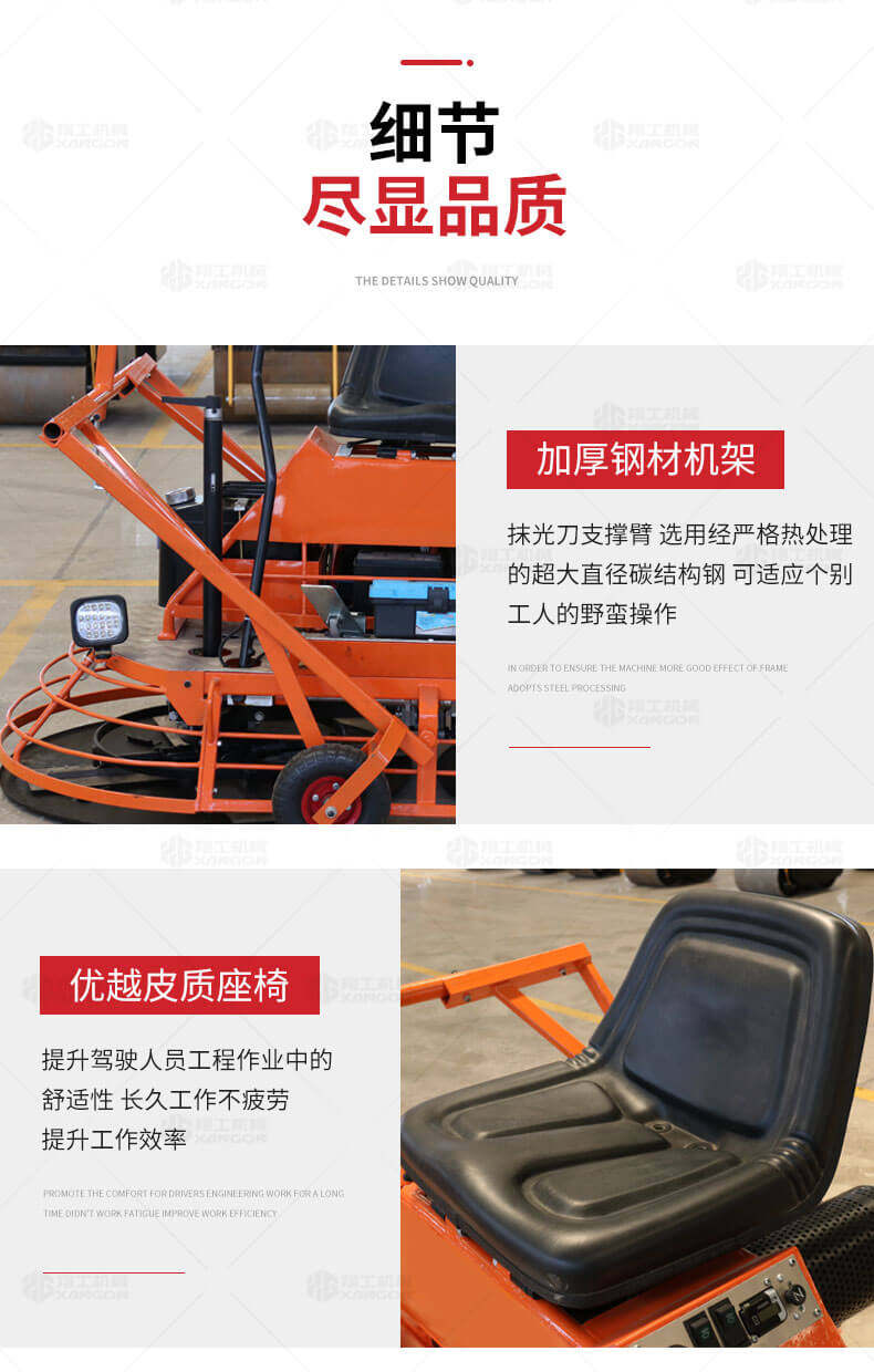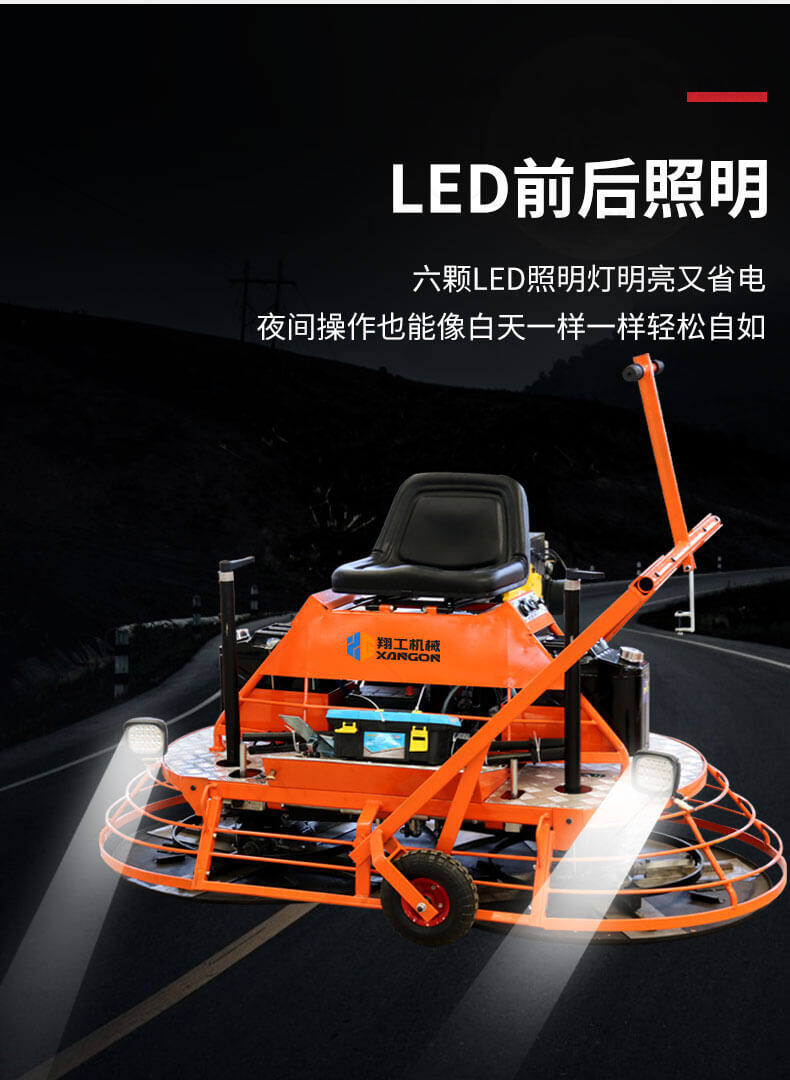 座駕式混凝土抹光機(jī)用于混凝土地面的提漿、壓實(shí)、抹平、抹光,相對(duì)于手扶式抹光機(jī),效率高。