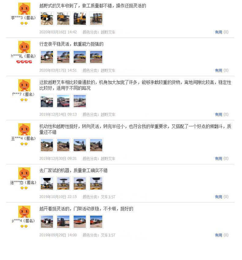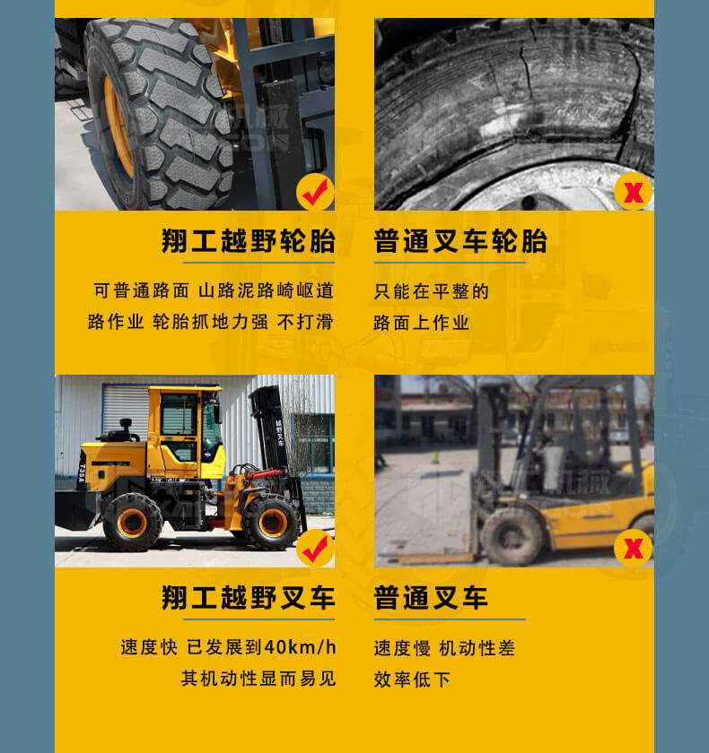 3.普通叉車只能在平整的路面上作業(yè),而越野叉車既可以在普通路面上作業(yè),還可以在山路泥路崎嶇道路作業(yè),輪胎抓地力強(qiáng),不打滑。